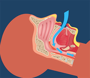 In mouth breathing the tongue sits low in order to allow for the passage of the air to the lungs through the mouth. This results in air turbulence during sleep and causes snoring. Furthermore, since the tongue sits low, it can fall backwards during sleep and partially or completely block the airways, resulting in sleep apnea.